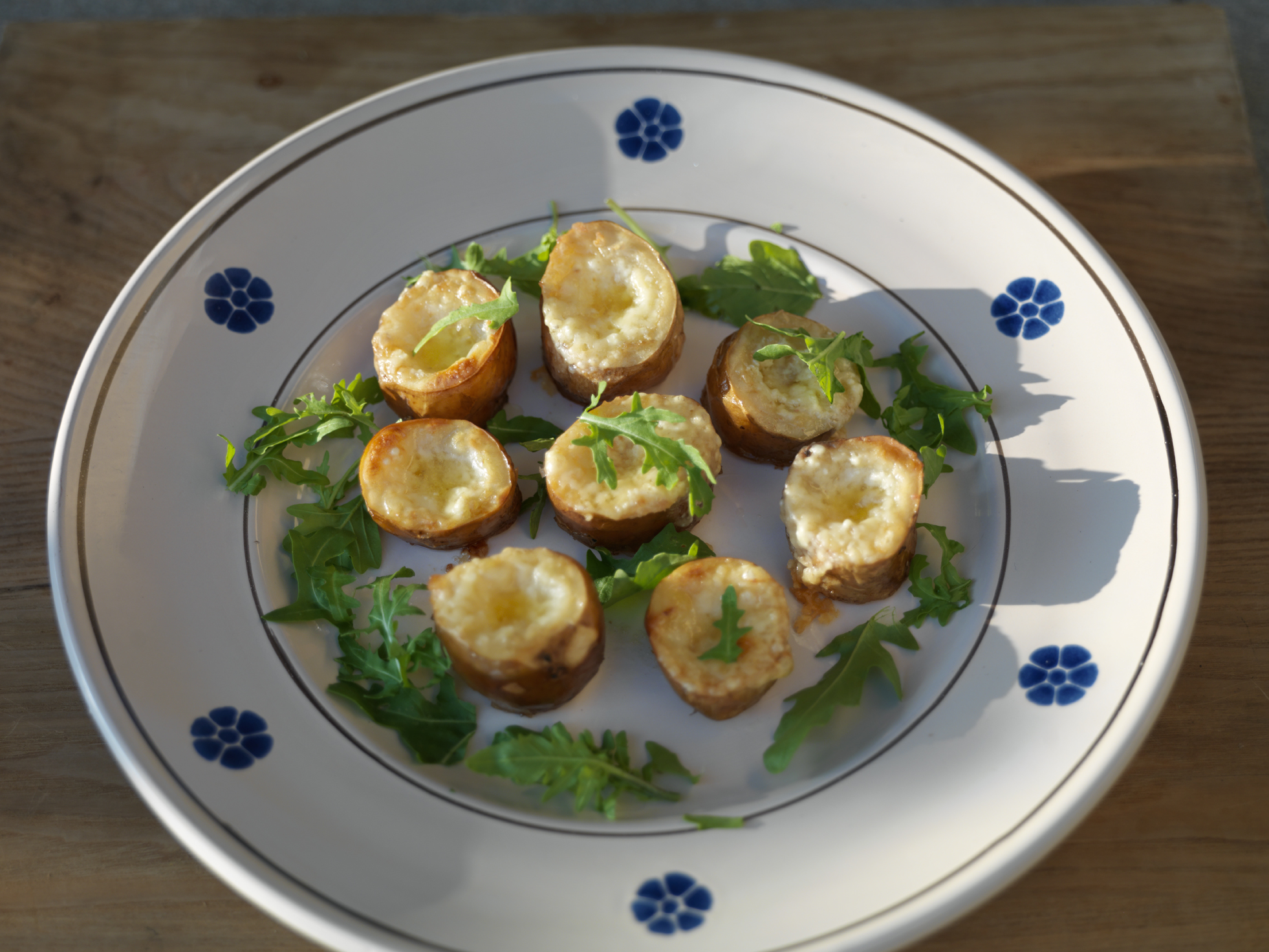 - Dela potatisen på mitten och skär bort en liten del av undersidan för att potatisen ska kunna stå plant