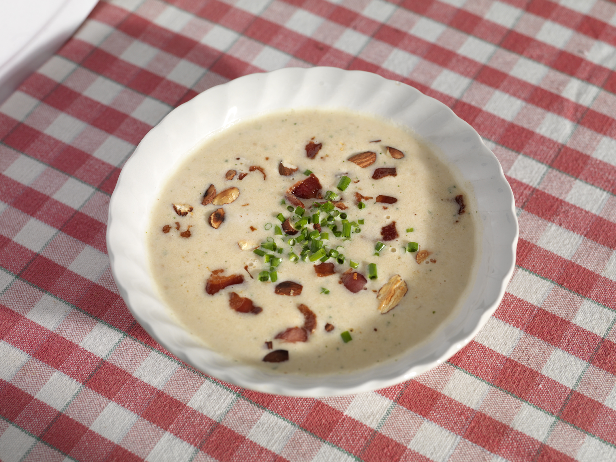 - Servera på tallrikar och garnera med mandel, bacon och gräslök