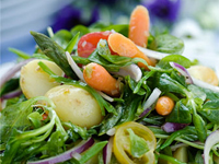 ”En sallad med det godaste från den svenska sommarskörden. Salladen kan serveras kall eller ljummen som en huvudrätt.”